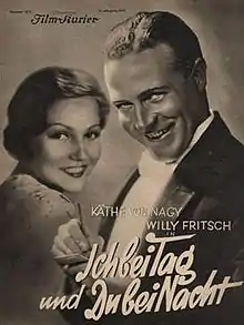 I by Day, You by Night (German: Ich bei Tag und du bei Nacht) is a 1932 German musical comedy film directed by Ludwig Berger and starring Käthe von Nagy and Willy Fritsch. It was shot at the Babelsberg Studios and on location at the Sanssouci Palace in Potsdam. The film's sets were designed by the art director Otto Hunte. It premiered in Berlin on 29 November 1932.[1]