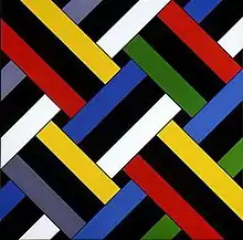 In 1975 Scott produced a large number of works on paper that contain the basic ingredients of what became the Lattice series, an immense body of acrylic abstract paintings that he worked on intensively during the second half of the 1970s, and which he returned to repeatedly throughout the rest of his life.[22] The Lattice paintings are typically based on a flexible, constantly varied system of usually diagonal, interlaced bands of colour, within a square canvas. "The basic over and under pattern which holds the forms meshed together on the picture surface is common to all the paintings of the Lattices."[23] Early examples from 1976 to 1977, such as Lattice No. 11 (May 1977, Christchurch Art Gallery), have white horizontal and vertical as well as diagonal bands, their edges marked by black crayon rubbed along the edges of masking tape, with brightly coloured bands seeming to form a grid behind the white bands.[24] From 1978 onwards, the crayon lines were eliminated in favour of clean, masked edges of abutted colour, and with the exception of the Asymmetrical Lattices the square canvas became the standard support. A key example of this highly resolved system is Lattice No. 45 (1978, Dunedin Public Art Gallery), with which Scott won the 1978 Benson & Hedges Art Award.[25] Scott invented a considerable range of compositions within the overall Lattice series, varying the width, layout and organisation of the bands as well as the range and intensity of the colours. A number of works, such as Lattice No. 58 (July 1979, Museum of New Zealand Te Papa Tongarewa), have black bands alternating with high-keyed colours, whereby, as art historian Elva Bett observed, "a vast three-dimensional depth is created as the bands of strident colour whip and pull beyond the canvas."[26] Others are pared back to white against raw canvas, or black and raw canvas. An example of the latter is Lattice No. 91 (1982, Museum of New Zealand Te Papa Tongarewa).