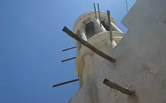 Outside the majlis, a verandah runs along the length of the building, with four serrated archways and columns to its exterior. As well as teak beams, mangrove poles supported the roof, with woven barasti, palm fronds, packing the ceiling space. The building itself is of gypsum and coral, the latter keeping the walls porous and breathable, while wind scoops in the walls helped to ventilate the space. The courtyard of the majlis was shaded by a large tree that the family would sleep around in the hot summer months.[6] The house was abandoned in the 1970s until it was renovated and opened to the public as a museum in 1996,[7] prior to the construction of the Al Bait Hotel, which incorporates the Bait Al Midfa and three other merchants' houses into its structure. Two of Al Midfa's brothers' houses also form part of the hotel building - Bait Eissa Al Midfa forms the hotel reception and Bait Abdul Rahman Al Midfa has become the Heritage guestroom block.[8]