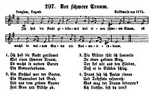 The best-known and most widely used lyrics to the melody were written by German preacher and collector of folk songs August Zarnack.[2][3] Zarnack's version was originally published under the title "Der schwere Traum" (The heavy dream), and appeared in Zarnack's 1820 book which was a collection of German folk songs intended for primary schools.[4][5] Zarnack's textbook sold well, and in the 1840s and onwards, "Ich hab die Nacht geträumet" was increasingly included in other music workbooks as well for schools and choirs.[2]