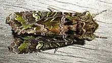 Ichneutica chlorodonta, also known as the Green-toothed Owlet, is a moth of the family Noctuidae.[2] This species is endemic to New Zealand. It is found throughout the North, South and Stewart Islands and is associated with native forest and shrubland. It can be confused with similar looking species such as I. subcyprea however I. chlorodonta can be distinguished through differences in colouration of its fore and hind wings as well as the length of the male pectinations. The life history of this species is unknown as are the host species of its larvae but adults of I. chlorodonta are on the wing from September to April.