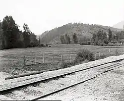 A picture of the Idaho Northern right of way near Linfor, Idaho, looking toward present day Bumblebee Campground and the junction of the Little North Fork of the Coeur d'Alene River and the North Fork of the Coeur d'Alene River. (1920)