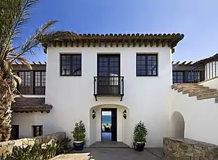 IKB's stylistic range extended beyond Shingle Style in numerous designs responding to diverse conditions, vernacular styles and client preferences.[51][52] In Green Springs Farm (Louisa, Virginia (2004), the firm reconciled the clients' desire for an informal farmhouse with a historic locale known for symmetrical, classical homes. It combined iconic formal elements of traditional southern homes with a rambling, seemingly ad-hoc assemblage of Acropolis-inspired, white Greek Revival forms.[53] Hawaiian Longhouse (Maui, Hawaii, 2004) offered a diametrically contrasting aesthetic and geography, resurrecting the single-story, thatched-roof Polynesian longhouse style—including a soaring great room—unexpectedly paired with Shingle-Style features and a second-level master offering ocean views.[7][22] In the Tropical Split-Level (Kaanapali, Hawaii, 2006), the firm distilled island, bungalow and Mediterranean elements in a contemporary design that freed the vernacular styles of strict precedent.[54] Mexico Beach Retreat (Cabo San Lucas, Mexico, 2009) used a "divided house" approach to integrate a mandated Mexican village vernacular style with contemporary villa design; the street-facing exterior featured traditional peaked tile roofs and multipane windows, while the ocean side offered sweeping, modern rounded forms, glass expanses and a curved, dissolving pool.[55][56][22]