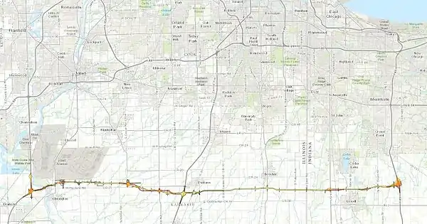 The Illiana Expressway, also known as the Illiana Corridor, was a controversial proposed toll road in northeastern Illinois and northwestern Indiana. Formal environmental impact statement studies were begun in April 2011 and were led jointly by the Illinois Department of Transportation (IDOT) and Indiana Department of Transportation (INDOT). It was planned as being approximately 50 miles (80 km) in length, mostly in Illinois, connecting Interstate 55 (I-55) in Illinois to I-65 in Indiana. The freeway was scheduled to open in 2018.[1] However, construction plans were shelved in 2015 when Illinois Governor Bruce Rauner issued an executive order delaying the construction of new highways in the state.[2]