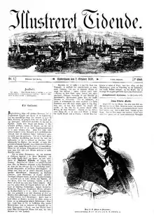 Illustreret Tidende was founded by Otto Herman Delbanco (originally a music publisher) with inspiration from similar magazines elsewhere, such as the German Illustrirte Zeitung and the English Illustrated London News.[2] The first issue stated the raison d'être of the magazine: "a weekly report on important events and contemporary celebrities, novels, stories, traveller's stories, and other contents from science, literature, art and industry".[3] The target group was the bourgeoisie and academics.