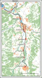 The Immenstadt–Oberstdorf railway is a non-electrified, single-track railway in the German state of Bavaria. The standard gauge line branches off the Buchloe–Lindau railway in Immenstadt and runs via Sonthofen to Oberstdorf. For its whole length it is in the district of Oberallgäu and follows the course of the Iller river. The branch line is operated by Deutsche Bahn. Together with the Neu-Ulm–Kempten railway, the line is also called the Iller Valley Railway (German: Illertalbahn). It is used by timetable routes 970 and 975.
