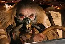 Later on, Furiosa and Max learn that the place they intended to go to has been ravaged, and change course to go back to the Citadel. When Joe realizes this, he leads his war party to attack them. In the ensuing climax, Furiosa attaches a chain to Joe's gas mask as well as one of the tires of his Gigahorse, ripping his mask and part of his face off, thus killing him. In the end, Joe's corpse is presented to his followers, and is torn to pieces in celebration.