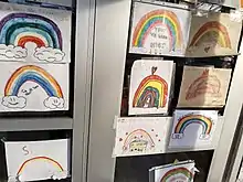 Optimistic drawings by children in Quebec, April 2020. Some use the phrase "Ça va bien aller", a slogan which translates to "everything will be all right".[1]