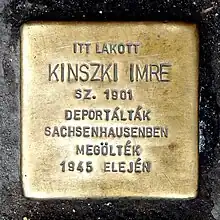 Stolperstein in memory of Mr. Imre Kinszki (1901–1945), at the entrance of his former domicile. (Budapest, District XIV, Róna Street Nr 121)