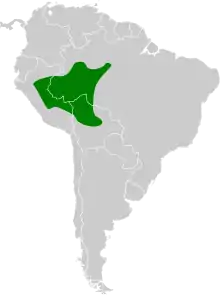 The Inambari woodcreeper is found in western Amazon Basin of eastern Peru, northern and central Bolivia, and western Brazil south of the Amazon River as far east as the Madeira River. It mostly inhabits terra firme and floodplain forest. It occurs less often in swamp forest and flooded várzea forest, and in shade coffee plantations in Peru. It favors the interior and edges of tall primary forest and mature secondary forest and is found only rarely in younger secondary forest. It elevation it seldom exceeds 1,000 m (3,300 ft) though it has reached 2,225 m (7,300 ft) in the Peruvian Andes.[7]