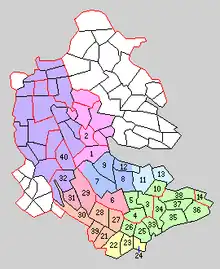 Towns and villages with number of the Shida (1-14) and Kōchi (21-40) districts in 1889. Currently in Peach: Tsuchiura City, Orange: Ryugasaki City, Red: Ushiku City, Purple: Tsukuba City, Yellow: Kawachi Town, Green: Inashiki City, Blue: Ami Town, Light Blue: Miho Village.