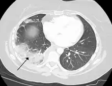 Micrograph of a pulmonary infarct (right of image) beside relatively normal lung (left of image). H&E stain.