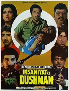 Insaniyat Ke Dushman (transl.Enemies of Humanity) is a 1987 Hindi-language action drama film directed by Rajkumar Kohli. The film features an ensemble cast of Dharmendra, Shatrughan Sinha, Raj Babbar, Sumeet Saigal, Dimple Kapadia, Anita Raj, Amjad Khan, Shakti Kapoor, Kader Khan, Aruna Irani, along with Smita Patil in a special appearance. The film revolves around a young lawyer seeking revenge against the perperators who raped his sister and drove her to suicide. It also contains a subplot revolving around an honest cop and his brother, and how the need for wealth drives them apart and leads to a situation where the cop is forced to arrest his own brother.