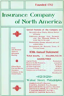 - ↑ “Insurance Company of North America,” Best's Insurance Reports (Fire and Marine Edition), 43rd ed. (New York: Alfred M. Best Company, Inc., 1942), p. 333.