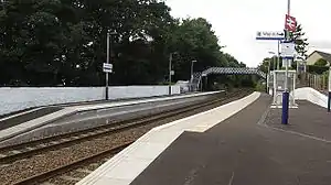 The station only has very basic facilities. Platform 2 has a small shelter, a bench and a payphone, whilst platform 1 only has a single bench. The only step-free access at the station is between Station Road and platform 2, although the ramp has a moderate gradient. The platforms are linked by a footbridge.[10] As there are no facilities to purchase tickets, passengers must buy one in advance, or from the guard on the train.