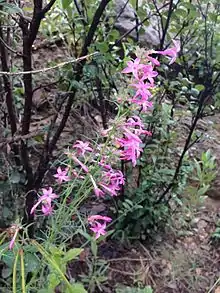 Holy Ghost ipomopsis is a perennial herb growing 30 to 80 centimeters (12 to 31 in) tall.[5] The leaves are mostly located around the base of the plant and wither as the plant flowers. Leaves on the stem become smaller toward the top. The inflorescence is a number of clusters of flowers, one at the tip of the stem and a few along the sides of the upper stem. The flower is bright pink with a thin tubular throat up to 2 centimeters (0.79 in) long opening into five pointed lobes each nearly 1 centimeter (0.39 in) in length. Blooming occurs in July through September.[6]