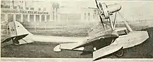 On the prototype (type P-1) the tail was held high above the water on an upward rising, triangular section, canvas covered fuselage or outrigger with a steel tube structure based on three longerons.[1] It was replaced on the production P-2s by a pair of sloping, parallel booms, braced at the rear by a V-strut from the end of the hull.[3] Both models had very similar rectangular rear surfaces, structurally similar to the ailerons, with braced tailplane and elevators. The fin and balanced rudder extended above and below the tailplane, the rudder moving in an elevator cut-out. The Privateer could be trimmed in-flight by tailplane incidence adjustment.[1] The last, more powerful model, the P-3, appeared early in 1932 with major revisions to the fuselage and tail. The open, two seat cockpit of the earlier models was replaced with an enclosed cabin for three. The rear fuselage, like that of the P-1, was a single piece structure but slimmer and more rounded than that of its predecessor, and the rectangular rear surfaces of earlier models were replaced with blunted triangular fin and tailplane.[2]