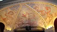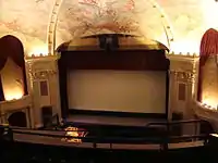 The proscenium mural of the theatre displays a stunning 3-piece canvas painting by artist William Hasenberg. The mural was painted during the finishing stages of construction in 1927 to complete the theatre's grand scale look. During a renovation in 1973, the mural and surrounding ceiling was painted with dark blue and white paint. The repainting was thought to have destroyed the mural until restoration efforts by muralist David Strickland proved successful in removing the blue and white paint without destroying the underlying mural. The 1994 restoration project restored the mural to its original look. The mural, now perfectly restored, catches the eye of every guest who steps into the auditorium.