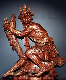 19th-century ship decoration of an Iroquois warrior sitting on a turtle, referencing the Great Turtle that carries the Earth in Iroquois mythology. Made in the sculpture workshop of the naval arsenal in Brest, France.