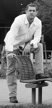 American actor Gunner Wright was cast as Isaac Clarke, with the character's in-game model from Dead Space 2 onwards designed to match Wright's facial features.[15][13] To prepare for the role, Wright was provided with drawings, concept art, back story and notes about the character in addition to the game's script.[15] During the motion capture process, Wright wears a lycra suit and a headband attached with motion capture and recording equipment for his facial expressions and body gestures; he was occasionally shown animated snippets of in-game scenes in between filming takes to provide further context for his performance, which served as the basis for the character's in-game actions.[16] Wright said the role appealed to him, as he liked portraying ordinary and relatable characters who find themselves forced into extreme circumstances.[17] Wright remarked that he is not a gaming enthusiast or gamer himself, though he set a high standard for himself when playing Isaac and took it as seriously as any other acting role.[18] A scene where Isaac locks Ellie into a ship which carry her to safety against her consent resonated with Wright from an acting perspective, which he described as "emotional and pivotal".[16] He remarked that fan feedback on social media towards his portrayal of the character had been positive, and noted that there are gamers who want a deeper story and well written characters for their video game experiences.[19]