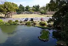 Isahaya Park (also known as Azalea Park) is in Isahaya in Nagasaki Prefecture, Japan.[1] It was built on the ruins of Isahaya castle (also known as Takashiro) during the Taishō period. The park is famous for its azalea blooms, and the "Azalea Festival" is held here, on and around April 10 every year. The park is also known for its "Spectacles Bridge" (see below) over the pond. The park is about 50 minutes by bus from Nagasaki city.
