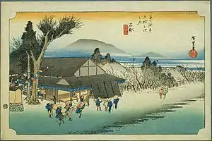 Hiroshige's print of Ishibe-juku, part of the Hōeidō edition The Fifty-three Stations of the Tōkaidō series