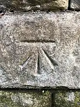 The benchmark was carved into a north facing vertical rock on the Isle of the Dead on 1 July 1841.[74][75] The standard British ordnance survey benchmark of a broad arrow was used with the horizontal line measuring 50 cm across.[76] A small stone tablet was also installed above the benchmark recording the date the benchmark was struck and the measurements used to determine its position.[77] The tablet remained until the early 20th century when it was reported missing.[78][79]