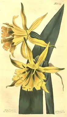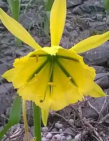 I. amancaes is a species with spherical bulbs 3.5–5 cm in diameter.[4][5] The leaves are strap-shaped, 25–50 cm long and 2.5–5 cm wide, bright green.[4][5] The 2–6 yellow pedicellate flowers are borne at the end of a scape up to 33 cm long.[4] The floral tube is greenish yellow, 5–7.5 cm long, bearing at the end the tepals, which are linear to narrowly lanceolate, 6–7.5 cm long, with green tips.[4][6] The floral corona is funnel-shaped, yellow with green stripes, 5–6 cm long, 6–8.5 cm wide, bearing the stamens facing inwards.[4][6][5]