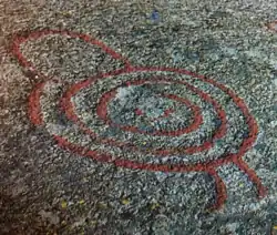 The rock art at Haugen farm has been described as the most picturesque rock carvings in Vestfold dated to the Bronze Age. On a mountain facing east, 100 meters down the road to Haugen farm, 78 small and large petroglyphs have been discovered. They are located over a 17-meter mountainside. The carvings include 28 ship and ship fragments, including petroglyphs of ships with tall stems, marked railing, and keels. 41 men have been carved onboard the largest ship carving. It also has carvings depicting numerous spiral figures, 37 cup and ring marks, and one circle.[17][18]
