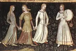 Another 14th-century illustration comes from the Florentine painter Andrea Bonaiuti (1343–1377). One of his series of paintings The Church Militant and Triumphant (Chiesa militante e trionfante) done in 1365 at a chapel in the church of Santa Maria Novella in Florence also shows women dancing accompanied by a woman on tambourine.[1]