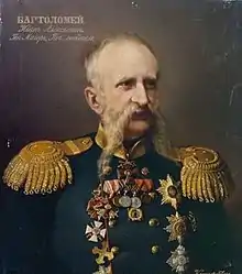 Bartolomei was born in St. Petersburg in the family of a Russian army general, originally of the Livonian noble family of von Bartholomäi. He took part in the Caucasus War and the Crimean War. In 1853, he led a mission to bring the mountaineers of Free Svanetia under Russian suzerainty. He was promoted to lieutenant-general in 1865. Beyond his service as an Imperial general and bureaucrat, Bartolomei was interested in the peoples and cultures of the Caucasus. He collected Georgian, Bactrian, Parthian, and Sasanian coins, which he subsequently donated to the Hermitage Museum. He authored several studies on the Caucasian ethnography and linguistics and first attempts at creating Abkhaz and Chechen primers.[1] He died in Tiflis in 1870.