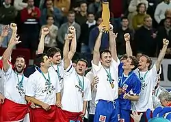 Left-to-right: Balić, Renato Sulić, Denis Špoljarić, Nikša Kaleb, Slavko Goluža, Mirza Džomba, and Goran Šprem celebrating winning the 2003 World Championship in Portugal