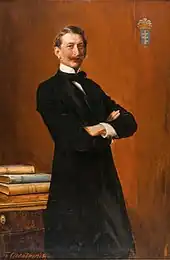 Potocki was the second son of Galician governor Alfred Józef (1817–1889) owner of Łańcut and Maria née Sanguszko (1830–1903) and came from a wealthy landed family. Educated at home and in the Franciscan University at Lviv where he studied law he returned to manage his estate. From his mother he inherited estates in Smołdyrów, Antoniny and Szepetówka in Volhynia totalling 63,000 hectares. He also inherited the palace at Krakowskie Przedmieście in Warsaw which is now the office of the Ministry of Culture in Poland. He established a horse breeding farm,[1] travelled on hunts to Asia and Africa writing about his exploits. He also inherited a large library part of which was destroyed in World War I. One of the first attempts to bring European bison from Białowieza back into Ukraine was made by Jan Sztolcman on Potocki's hunting estate “Pylyavyn” (Novograd Volyn district of Zhitomir region).[2] This private hunting estate was 7000 acres and stocked with both European and American bison. In 1917 the animals were killed.[3] He made his Antoniny palace into a baroque residence filled with hunting trophies and paintings.[4]