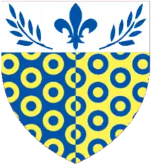 Per pale Azure and Or semé of annulets counterchanged, on a chief Argent a fleur-de-lis between two olive branches Azure.