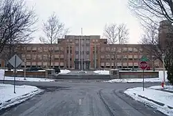 This verticality, while no longer as prominent of a feature, can still be seen elsewhere on the school. On the front of building above the main entrance, windows once stretched vertically between the spandrels, but have since been replaced with smaller horizontal windows and the remaining cavity was filled with an insulating stucco material. Between the windows, a band of concrete emblazoned with the school's name extends to the top of the building. Originally, all the windows had a vertical effect, but the replacement has altered its appearance. The change is quite apparent in photos to the right and the left. The new windows drastically decrease the sense of verticality.