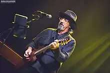 Sonni visited the Knopflers in London, and after David (and then Hal Lindes) left the band, Sonni was asked to join the band for the 1984 recording sessions for Brothers in Arms, and as rhythm guitarist and backing vocals for the subsequent Brothers In Arms world tour of 1985 -1986.[5] Sonni accepted, and played guitar synthesizer on "The Man's Too Strong" on the album.[5] He also played the Live Aid concert at Wembley, on July 13, 1985, with Dire Straits.[6] Sonni also appears in several of the Brothers In Arms official videos. After his collaboration with Dire Straits, Sonni contributed to other musicians' works, but ended his professional musical career when his twin daughters were born in 1988.[1] He began a second career as a marketing executive, first at Seymour Duncan, then Rivera Guitar Amplifiers followed by several years as director of marketing communications at Line 6, a manufacturer of digital technology products for musicians.[7] He was instrumental in the development and launch of POD, which he named and designed the shape of.[8] In 2001, he became vice president of marketing communication for Guitar Center.[9]