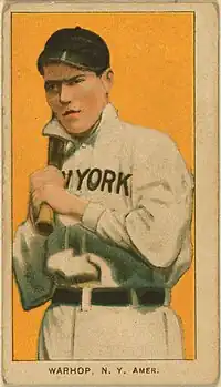 Warhop led the Yankees in games pitched four times (1908, 1909, 1912, 1914), saves three times (1909, 1910, 1912), and complete games once (1909).[9]: 593 His 114 career hit batsmen is a Yankees team record and ranks in the top 100 on the MLB all-time hit batsmen list.[3]