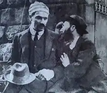 In November 1915, White produced a manifesto, "Ireland's Hour", for the pacifist paper, The Irish Citizen.[52] It called for a return to the idealism of the United Irishmen—a vision of a society of equals based on justice and freedom[51]—but did not, itself, propose armed revolt. (White later conceded that he had "no clear goal of violent revolution, national or social" when drilling the ICA).[35][53] After the Easter Rising, which found him in England, he hatched a plan to bring out the Welsh miners (cutting, he imagined, the coal supply to the British fleet)[54] on behalf of Connolly and his condemned comrades.[55] Arrested in May, on 2 August, he was transferred from Swansea to Pentonville Prison and confined within fifty yards of the hanging shed in which Casement was executed the following morning.[54][56] In December 1916 he visited Constance Markievicz, then in Aylesbury Women's Prison for her role in the Rising, lobbied on her behalf and when she was released in June 1917 was among the first friends she met in London.[57] Together with Eve Gore-Booth, they defiantly enjoyed strawberries and cream on the terrace of the House of Commons.[58]