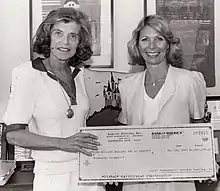 Eunice Kennedy Shriver (left) accepts a $4,000,000 check from Sorensen to benefit Special Olympics in 1982
