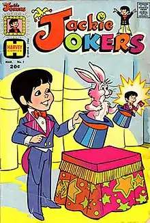 He debuted in 1973, in his own eponymous title, before being canceled and replaced by the title Richie Rich and Jackie Jokers later that year. He and his similar-looking father, Jerry Jokers, are both stand-up comedians. Also featured is Ben Booker, Jackie's talent agent. In every issue of Richie Rich and Jackie Jokers, a featured story would always show Jackie doing a parody of current films, TV shows, or commercials.