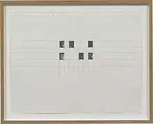 The 2013 exhibition at The Kitchen in New York City, Untitled (disambiguation) displayed an early series of his remnant paintings.[31] The exhibition was also unique for Kassay's interpretation of the performance venue's black box theater, as well his use of the institution's archive. Kassay said of the show: “I put work throughout the building in places where paintings rarely rest—such as in the video archive, or in the lobby—to emphasize their presentation as an almost momentary, contingent stage. The paintings were made so that they could be moved easily around the space and remain variable to the activity of the environment.”[17] In a review of a later show, New York Times critic Roberta Smith called Untitled (disambiguation) “quietly beautiful”.[32]