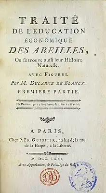 • Traité de l'éducation économique des abeilles, où se trouve aussi leur histoire naturelle, Paris, 1771, 2 parties in-12, avec figures.
