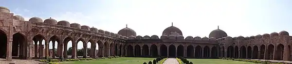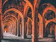 The fort is one of the finest examples of Afghan architecture in India.[6] The main entrance of the mosque is through the eastern entrance. The entire area of the mosque is 7,744 square metres (83,360 sq ft), built on an elevated platform 4.6 m (15 ft). The inscriptions on the eastern doorway to the porch indicates that the mosque was modeled on the basis of Mosque of Damascus.[7] The doorway also has marble jambs and lintels which are atypical of Hindu structures. The entry via eastern entrance leads to a large courtyard interspersed with colonnaded verandas on the three sides. The pillared verandas leads to the prayer halls which is covered with pillars with 58 small domes and three large domes. The prayer hall is full of arches. The central altar (called mihrab) is decorated with verses from Quran. The raised pulpit at the centre has a miniature pulpit made of marble. There are two entrances in the northern wall, one leading to the courtyard and other to the prayer hall.[8]