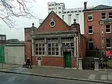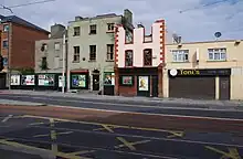 St. James's Gate, located where the modern street exists, was the western entrance to the city during the Middle Ages. During this time the gate was the traditional starting point for the Camino pilgrimage from Dublin to Santiago de Compostela in Galicia (Spain).[2] Though the original medieval gate was demolished in 1734,[3] the gate gave its name to the area in which it was located,[4] and in particular to the St. James's Gate Brewery (which was taken over by Arthur Guinness in 1759).[3]