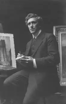J. Alphege Brewer with his "The Cathedral of St. Gudule.... Brussels, Belgium" (1914) on the easel