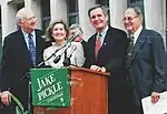 In 2002, on behalf of the U.S. State Department, Carville, and his wife, political consultant Mary Matalin, met with a group of 55 Arab women political leaders during the 2002 United States midterm elections. The programming, "Women as Political Leaders" International Visitor (IV) Program", was the first program implemented under the auspices of the Middle East Partnership Initiative, a collection of 40 programs headed by then deputy assistant secretary for Near East Affairs Liz Cheney.[82] In addition to events with Carville and Matalin, the group met with congressional, state and local campaign staff, and observed campaign work during their visits to Concord, New Hampshire, Dallas, Texas, Detroit, Michigan, Toledo, Ohio, Raleigh, North Carolina, and Tallahassee and Tampa, Florida.[83]