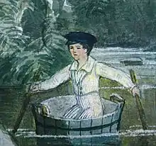 Detail of Jemima Wedderburn watercolour depicting a young James Clerk Maxwell paddling a washtub on the River Urr