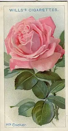 Cocker's three sons, William, James and Alexander, joined the company in the 1880s. With the growing popularity of roses, the Cockers initiated a rose breeding program in the early 1890s. After Cocker died in 1897, his three sons took over the management of the company. The nursery's initial rose introductions in 1892, were two sports out of the Hybrid perpetuals, 'Duke of Fife' and 'Duchess of Fife'. The nursery's first commercially successful rose variety was 'Mrs. Cocker' (1899). Alexander became the sole owner of the company after the deaths of his two brothers.[2] Alexander Cocker died in 1920 and the company was put into a trust for his two young children, Margaret and Alexander Morison (Alec) (1907-1977). The nursery was closed in 1923.[3]