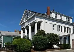It is a 2+12-story, wood-framed structure, three bays wide, with a front-gable roof and a flush-boarded facade sheltered by a monumental two-story, Greek Revival style portico with fluted Ionic columns. It was built in 1843 by James D. Hathaway, a carpenter, and was perhaps designed by Russell Warren or copied by Hathaway from his designs.[2] It is one of seven extant monumental temple-fronted Greek Revival houses in Fall River. It is also located within the Lower Highlands Historic District.