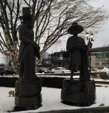 Wooden Statues of Chief Wattlekainen and James McMillan at the Innes Corners Plaza in Langley